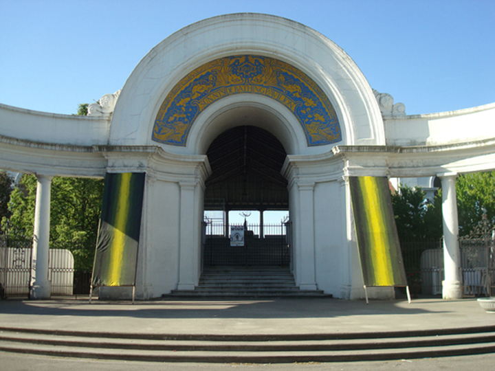 Because I had no work that would fit well into the exhibition, and that could sell, I decided to ‘decorate’ the building itself instead. My installation consisted of large yellow canvases that transformed the exterior adding colour to the white neoclassical looking structure.