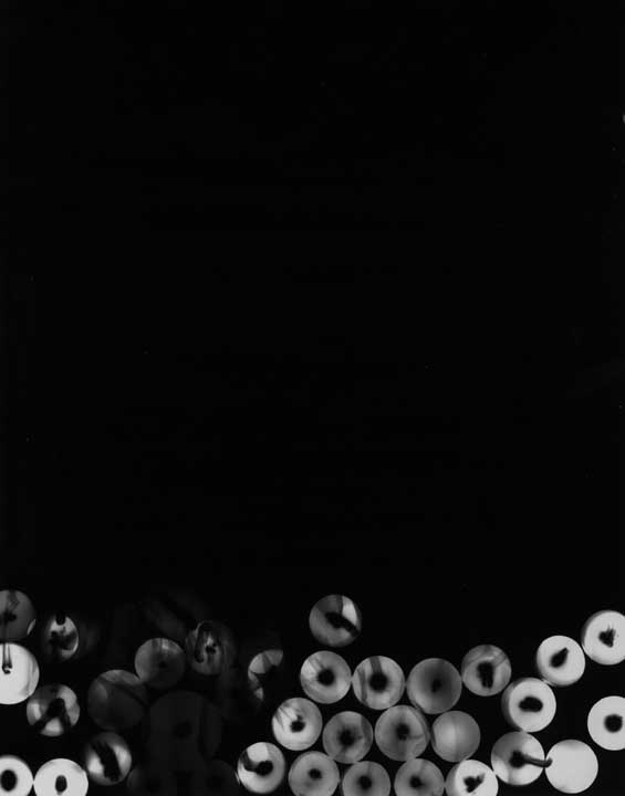 A series of photograms created by placing moving, rotating, vibrating or falling objects on photographic paper